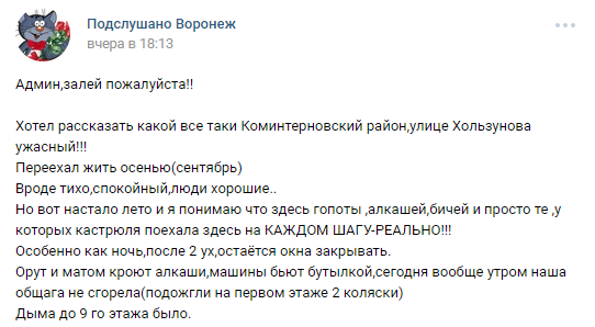 Прелести соседства с гопниками в Северном красочно описал воронежец
