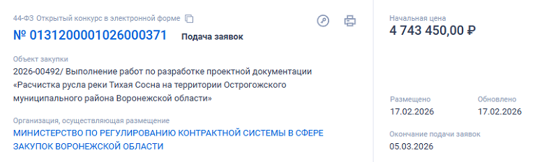В системе Госзакупок появился тендер на разработку документации для проекта «Расчистка русла реки Тихая Сосна в Острогожском районе». Торги на понижение с проектировщиками начинаются с суммы в 4,7 млн рублей. Это на создание документов, не на саму расчистку.