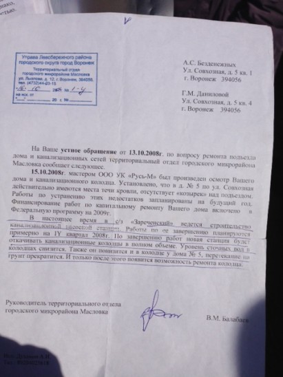 Как ранее писало наше издание, две недели назад ситуация в совхозе Зареченский достигла апогея – в квартирах, из труб в ванны и туалеты полезло дерьмо, и «пострадавшие» стали «закладывать» сливные отверстия тазиками. Надолго не помогало. Они вызвали аварийку, потом на следующий день, потом еще раз и еще. В конце концов рабочим надоело ездить. Зареченцы наняли частника, скинулись и оплатили откачку из сливных колодцев отходов. Незадолго до этого они составляли очередную жалобу в управу Левобережного района и собрали в специальную папочку все документы с пометкой «Зареченский». Среди них обнаружился любопытный экземпляр. Его показали на народном сходе в совхозе, состоявшемся по поводу решения коммунальной проблемы. В октябре 2008 году тогдашний глава Масловки Вячеслав Балабаев написал: