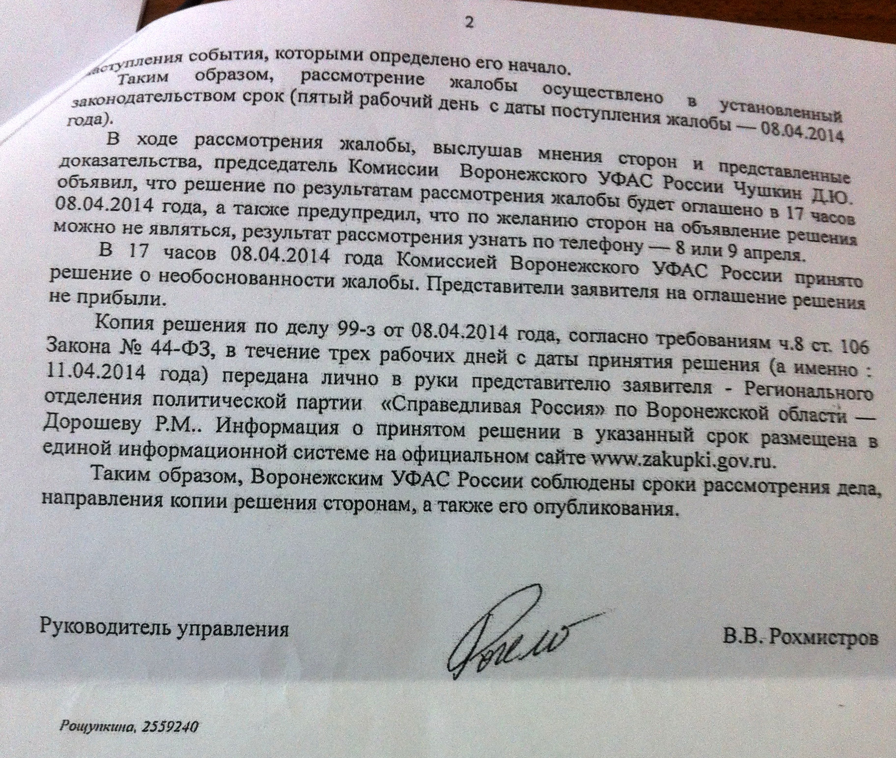 - В итоге рассмотрение жалобы состоялось 8 апреля, а решение было вынесено 9 апреля в 11.00, - сообщили в региональном отделении партии Справедливая Россия. - У нас имеется аудиозапись, доказывающая этот факт. Однако, 23 мая мы получили ответ от заместителя руководителя ФАС России Андрея Цариковского. Он ссылается на объяснение руководителя воронежского УФАС Владимира Рохмистрова, который пишет: в ходе рассмотрения жалобы председатель комиссии Воронежского УФАС России Чушкин Д.Ю. объявил, что решение по результатам рассмотрения жалобы будет оглашено в 17 часов 08.04.2014 года (см. иллюстрацию - прим. ред.). Мы думаем, что это заведомо ложные данные с целью сокрытия должностного преступления - на самом деле решение было оглашено не 8 апреля (максимально допустимый срок), а 9 апреля. И этому есть железные доказательства.