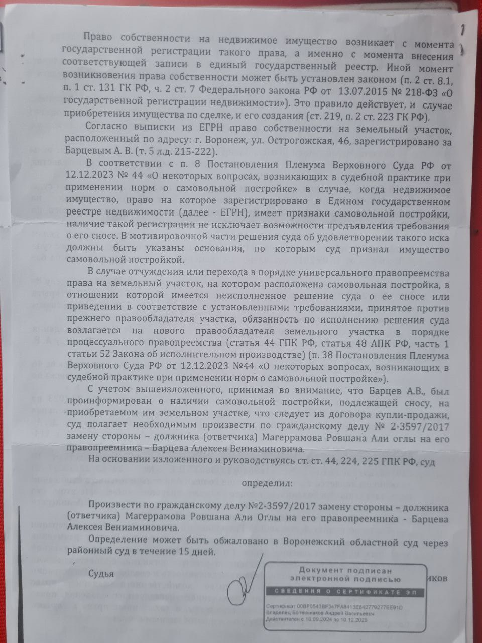 Общественник Константин Квасов рассказал «Блокнот Воронеж», что обязанность по сносу самовольной постройки была возложена на Барцева еще в июне 2025 года, когда он оформил на себя земельный участок на Острогожской, 46. Поскольку новый собственник не предпринимал никаких действий, городская администрация в сентябре подала два судебных иска: один о взыскании неустойки в размере около 3 млн рублей с Магеррамовых за неисполнение вердикта, второй – об изъятии территории у Барцева, который не приступал к сносу.