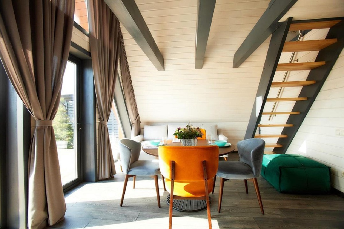 Такие строения полюбились множеству людей благодаря оригинальному внешнему виду с треугольной формой и панорамным остеклением. Жесткий каркас из строганой доски камерной сушки продлевает срок службы готового дома, сохраняя при этом прочность и легкость конструкции. Габариты строения могут быть практически любыми, а сборка занимает всего несколько месяцев.