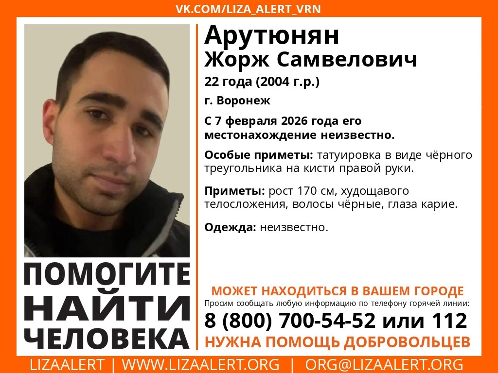 Жорж Арутюнян таинственно исчез 7 февраля. Из особых примет у 22-летнего парня на кисти правой руки есть татуировка в виде черного треугольника. Он имеет рост 170 см, худощавое телосложение, чёрные волосы и карие глаза. В чём был одет в момент пропажи – неизвестно.