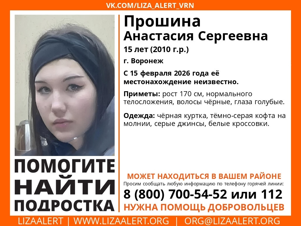 О судьбе 15-летней Анастасии Прошиной ничего неизвестно с 15 февраля. Родственники девушки забили тревогу, так как вышла из контакта с ними. Её рост составляет 170 см, она нормального телосложения, у неё черные волосы и голубые глаза.