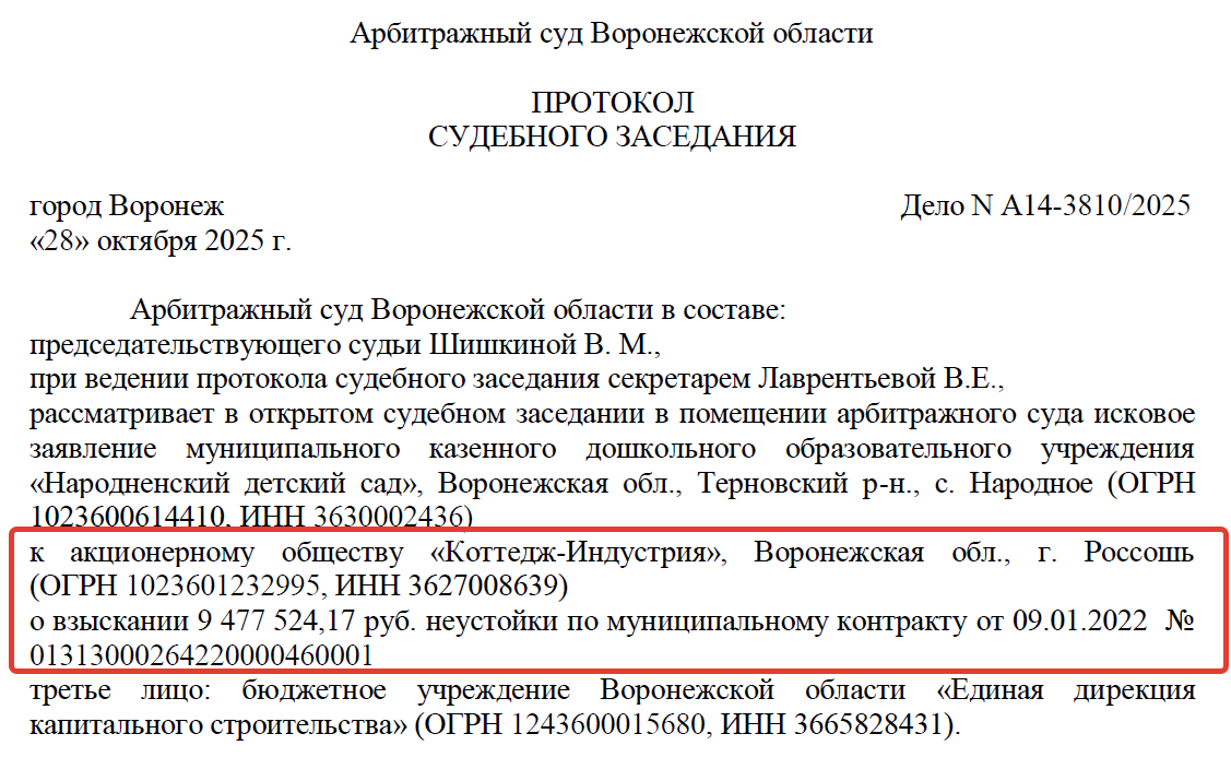 Скорее всего, дополнительные 43 млн рублей (или около 30 процентов от первоначальной цены контракта) были оплачены из бюджета Воронежской области, которая изначально финансировала этот проект примерно на 99 процентов. А значит региональные власти имеют прямое отношение к строительству детского садика, но в Арбитражном суде они не выступают сообща (как сторона истца) с администрацией дошкольного учреждения. Руководство последней несколько раз штрафовало АО «Коттедж-Индустрия», сумма пяти штрафов – свыше 9 млн рублей. Ни один из них не был оплачен подрядчиком.