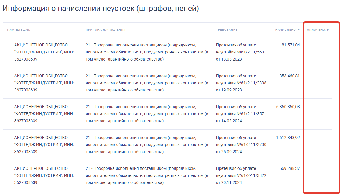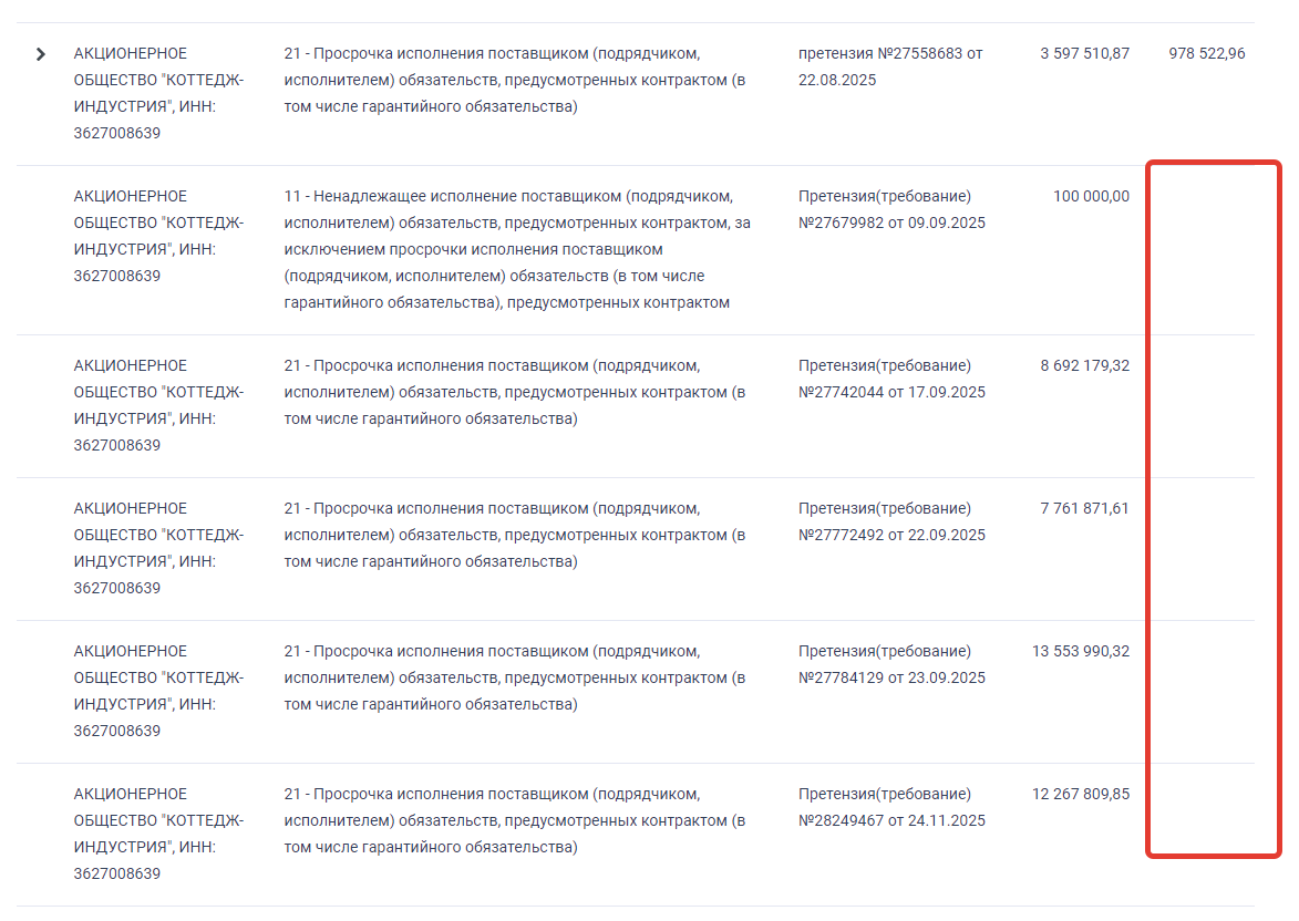 скриншот из карточки исполнения другого контракта, в рамках которого АО "Коттедж-Индустрия" строила в Воронеже школу №45 и получила множество штрафов от заказчика, их общая сумма около 47 млн рублей