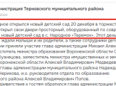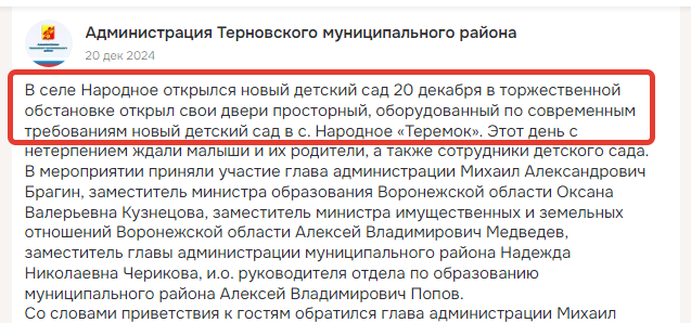 скриншот из пресс-релиза администрации Терновского района об открытии в селе Народное детского садика 20 декабря 2024 года