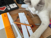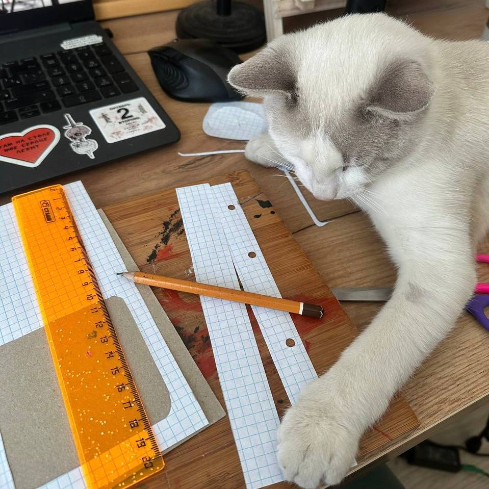 Несмотря на то, что у него лапки, Пряник всегда готов помочь. Вот он устроил тотальный контроль над канцелярскими принадлежностями, прилег на чертежи и линейку. Проверяет точность расчетов и не позволяет допустить ни одной ошибки.
