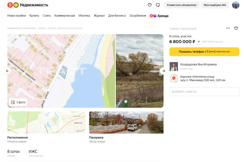 Участок в водоохранной зоне выставили на продажу почти за 7 млн рублей в Воронеже