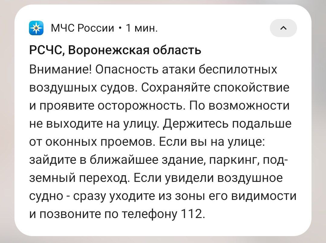 – Силы ПВО наготове. Следите за дальнейшими оповещениями от правительства области или от МЧС России, – отметил глава Воронежской области.