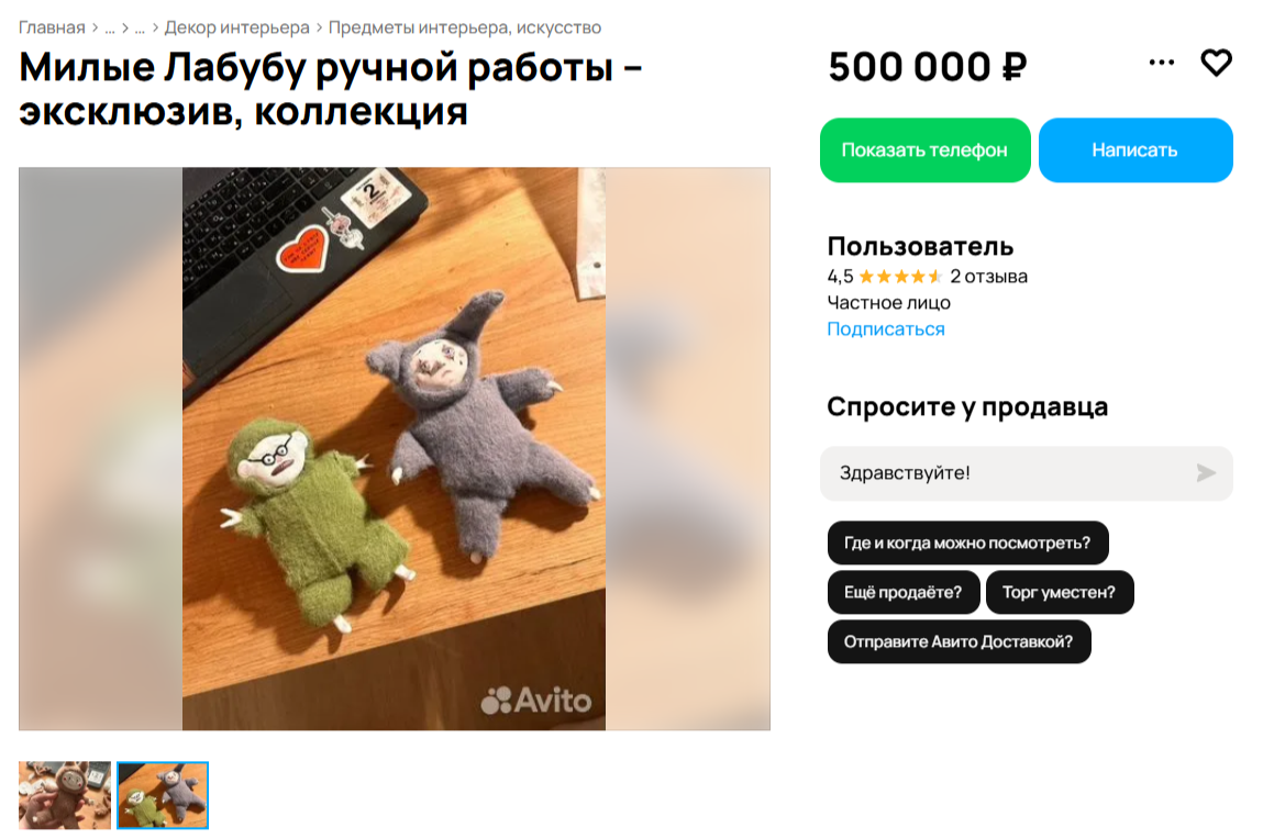 Местный мастер выставил на продажу «очаровательных Лабубу ручной работы» и установил цену, мягко говоря, впечатляющую — 500 тысяч рублей за штуку.