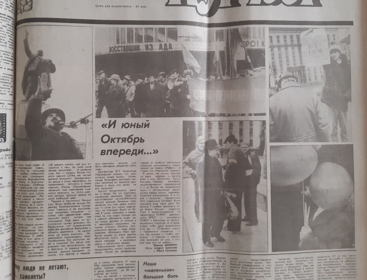 - В целом же митинг прошел «в одни ворота» - ругали всех и вся. Досталось Бушу, Ельцину, Гайдару, ваучерам, акционированию предприятий и т.д. Выход же предлагался один – объединение трудящихся перед лицом вырождающегося капитализма. А суете и лозунгах приветствий 75-я годовщины Октября была упущена еще одна дата. Накануне 7 ноября прошлого года Борис Ельцин подписал указ о приостановлении на территории РСФСР деятельности КПСС и компартии РСФСР и роспуске их организационных структур. А я представил себе двух ровесников этих дат – 75-летнего старца и годовалого младенца – они так похожи – слабы, капризны, а главное – первый уже выживает из ума, а второй его еще не набрал, - говорилось в заметке газеты «Воронежский курьер».