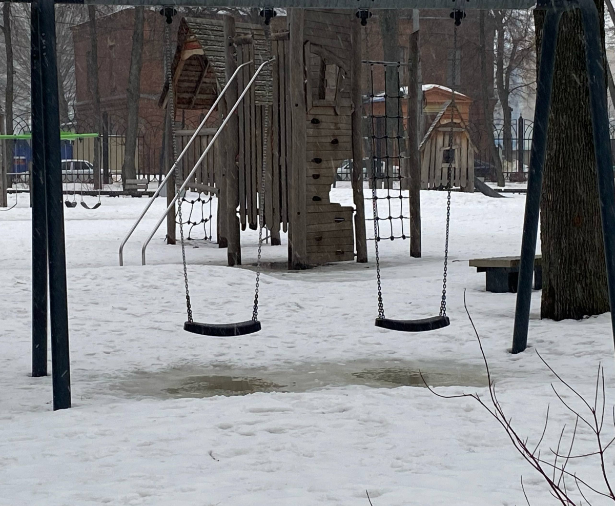 Машины проезжают мимо, поднимая брызги. Тротуары пустые, как и скамейки; на них никто не сидит, ведь холодно и мокро. Где-то хлопает дверь подъезда, где-то лает собака, где-то играет музыка из припаркованной машины. Город живёт своими звуками, даже когда кажется, что всё замерло.
