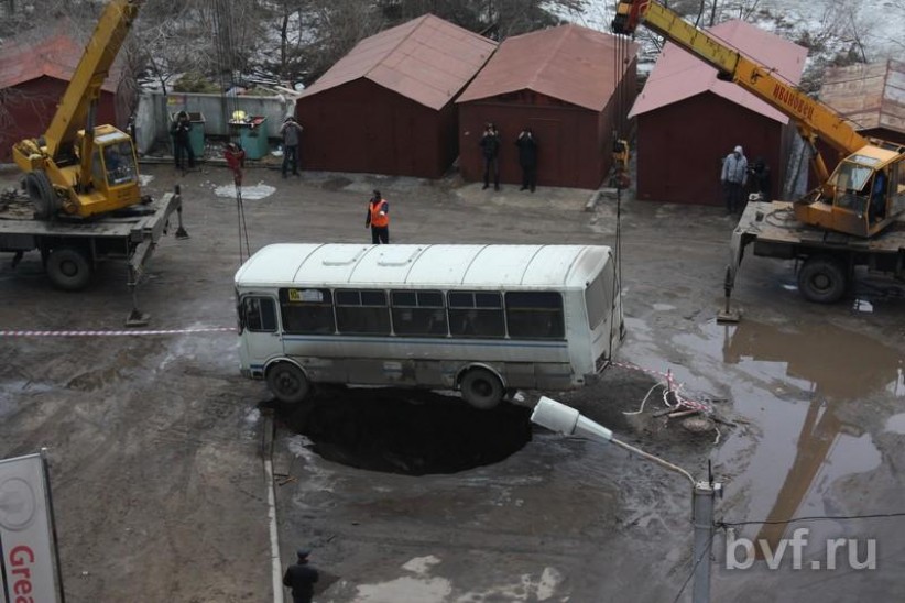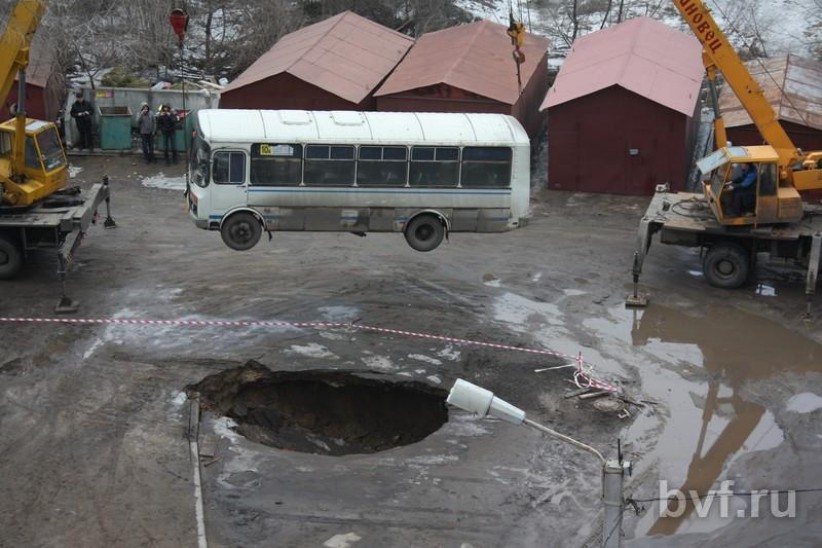 На место происшествия пригнали кран, подсунули под днище автобуса тросы и вытянули ПАЗик из бездны. Судя по фотографиям яма довольно глубокая и автобус мог провалиться туда полностью.