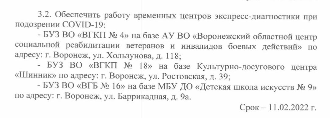 Сообщается, что воронежцев, которые заболели и решат провериться на ковид, смогут пройти оперативную диагностику и получить совет врача на территории Воронежского областного центра социальной реабилитации ветеранов и инвалидов боевых действий (Хользунова, 118), культурно-досугового центра «Шинник» (Ростовская, 39), а также на базе детской школы искусств №5 (Баррикадная, 9а).
