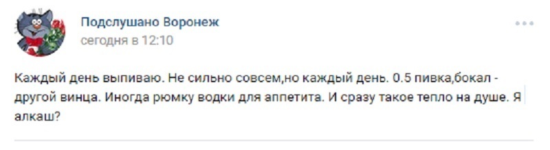 - 0,5 пивка, бокал-другой винца. Иногда рюмку водки для аппетита. И сразу такое тепло на душе. Я алкаш? - решил выяснить парень у воронежцев.