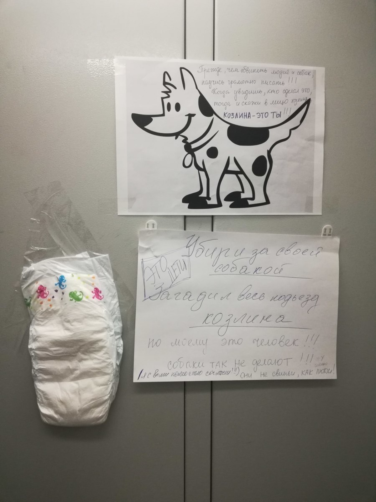 В перепалку вступил, по всей видимости, хозяин собаки, который приклеил еще одну листовку с изображением животного. А рядом с соседской перепиской и вовсе кто-то повесил памперс.