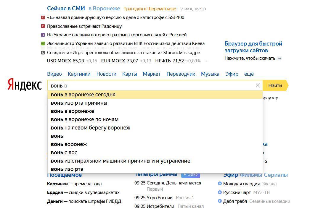 В редакцию обратился читатель, который подметил, что если в самом популярном российском поисковике «Яндекс» вбить слово «вонь», то на первой же строчке появится словосочетание «вонь в Воронеже сегодня». При этом в списке популярных запросов есть и другие проблемы, интересующие пользователей и никак не связанные со столицей Черноземья.