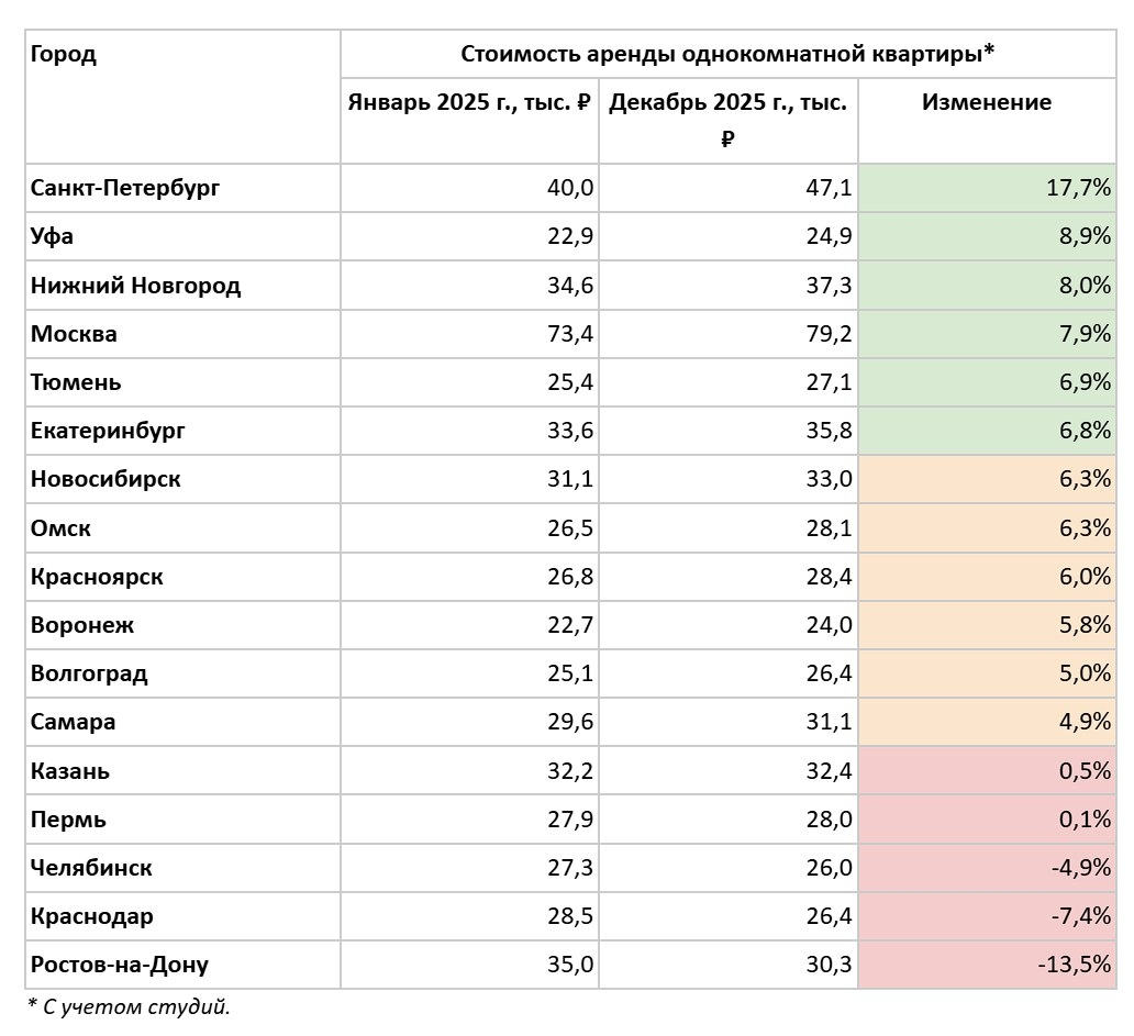 По данным экспертов, изучающих ситуацию на рынке аренды, всего в шести крупнейших городах России в 2025 году стоимость аренды однушки росла быстрее инфляции. А именно – в Санкт-Петербурге (47,1 тыс руб), Уфе (24,9 тыс руб), Нижнем Новгороде (37,3 тыс руб), Москве (79,2 тыс руб), Тюмени (27,1 тыс руб) и Екатеринбурге (35,8 тыс руб). Как видим, Воронежа в списке нет.