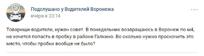 - Товарищи-водители, нужен совет. В понедельник возвращаюсь в Воронеж по м4, не хочется попасть в пробку в районе Галкино. Во сколько нужно проскочить это место, чтобы пробки вообще не было? - пишет автомобилист.