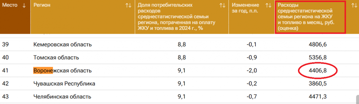 Доля потребительских расходов среднестатистической воронежской семьи на ЖКУ и топливо снизилась на два процентных пункта до 9,1%. Получается, что обычной семье внутри региона хватает на коммуналку 4 тысяч 406 рублей и еще остается, чтобы на эту сумму целый месяц заправляться. И это мы еще находимся в середине списка, на 41 месте. В Ингушетии, если верить эти данным, вообще балдеж – на все про все хватает 4,6% дохода. Коммуналка плюс топливо в республике обходится в 3,5 тысячи рублей.