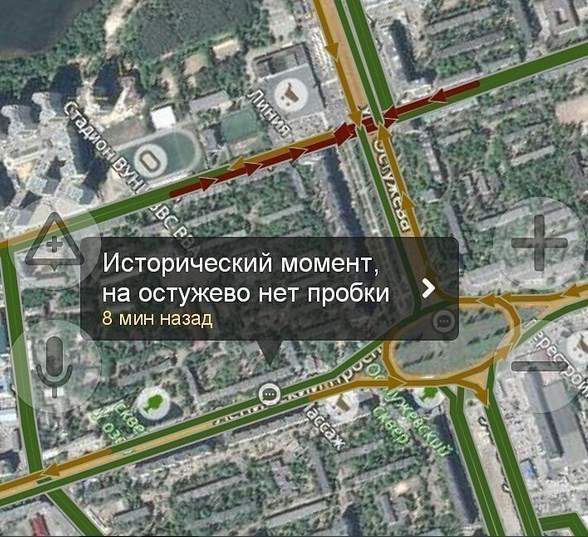 Воронежцы обсуждают снимок одного из автомобилистов, который в шутку заявил, что поймал «исторический момент». На нем виден участок карты с Остужевским кольцом, более-менее свободным для проезда.