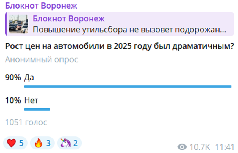 По следам высказывания мы решили запустить опрос в своем телеграм-канале. Подписчикам было предложено решить, драматично ли выросли цены на машины в 2025 году. Из 1049 проголосовавших 90% ответили, что ценник все-таки изменился драматически (возможно, люди еще переваривают пертурбации прошлых лет). Остальные же 10% солидарны с министром.