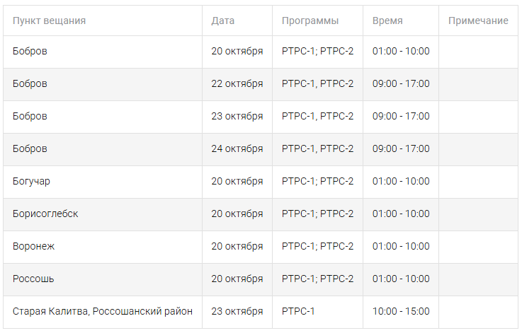 Кроме Воронежа, кратковременные перерывы трансляции запланированы в Боброве (20, 22 и 23 октября), Богучаре (20 октября), Борисоглебске (20 октября), Россоши (20 октября) и Старой Калитке (23 октября).