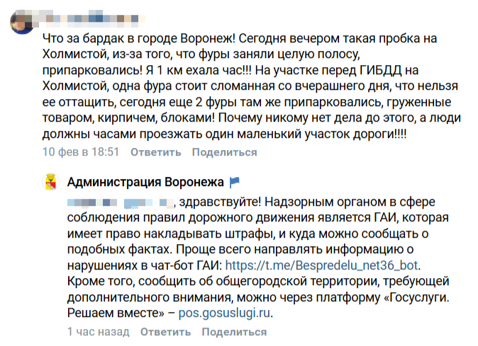 «Надзорным органом в сфере соблюдения правил дорожного движения является ГАИ, которая имеет право накладывать штрафы, и куда можно сообщать о подобных фактах», – отметили в мэрии Воронежа.