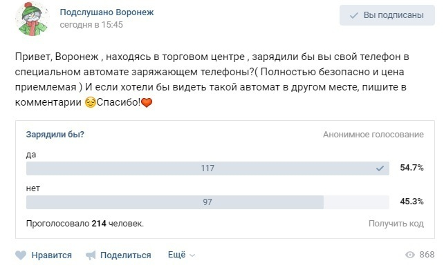 Жители Воронежа рассказали об отношении к платным станциям зарядки мобильных телефонов, которые могут быть установлены в торговых центрах и других общественных местах. Горожане приняли участие в интернет-опросе, который провели в соцсети "ВКонтакте".