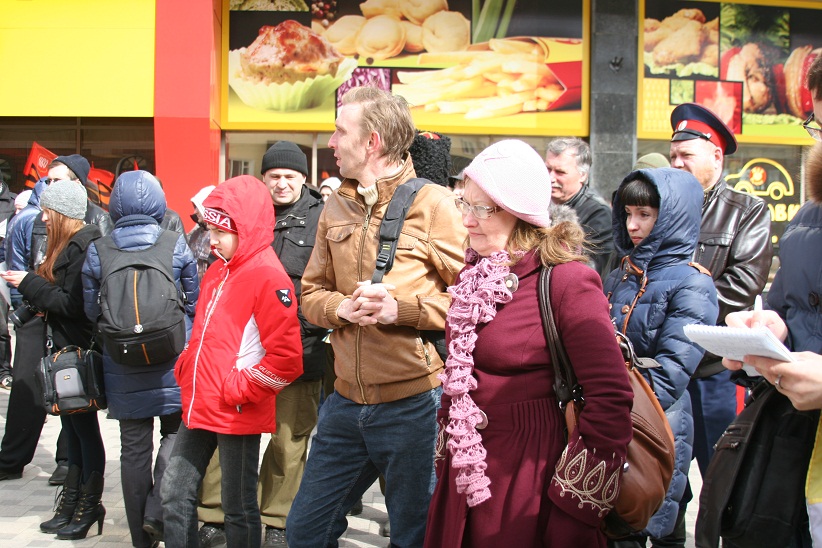 После каждого выступления ораторов публика аплодировала. Скандировали: «Держись, Луганск! Воронеж с тобой!», «Бандеры не придут!», «Да здравствует Луганск!», «Русские, вперед!», «Русские непобедимы!». В воздухе развевались флаги общественных организаций, партий и Российской Федерации. Напоследок Анастасия Пятерикова расчувствовалась. Со слезами на глазах она стала призывать всех русских не сидеть на месте: