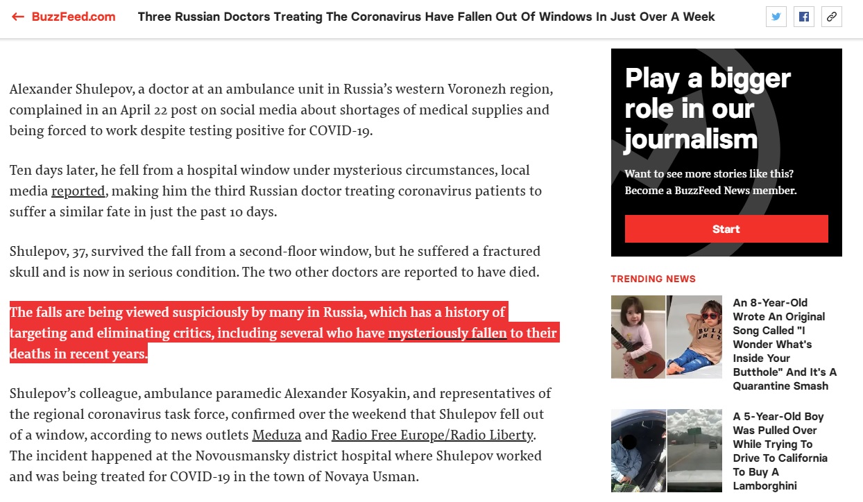 «Падения (прим. из окна) многими воспринимаются с долей подозрения в России, где исторически сложилось преследование и уничтожение критиков, в том числе нескольких человек, загадочно погибших в последние годы», – пишет автор Buzzfeed из Киева Кристофер Миллер.