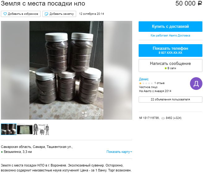 Некий Денис из Самары предлагает приобрести землю, на которую приземлялся неопознанный летающий объект. Правда, никаких подробностей происхождения сувенира человек не разглашает. Когда и при каких обстоятельствах НЛО бывало в столице Черноземья – остается загадкой.